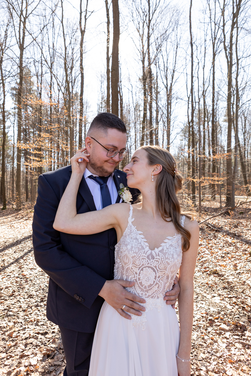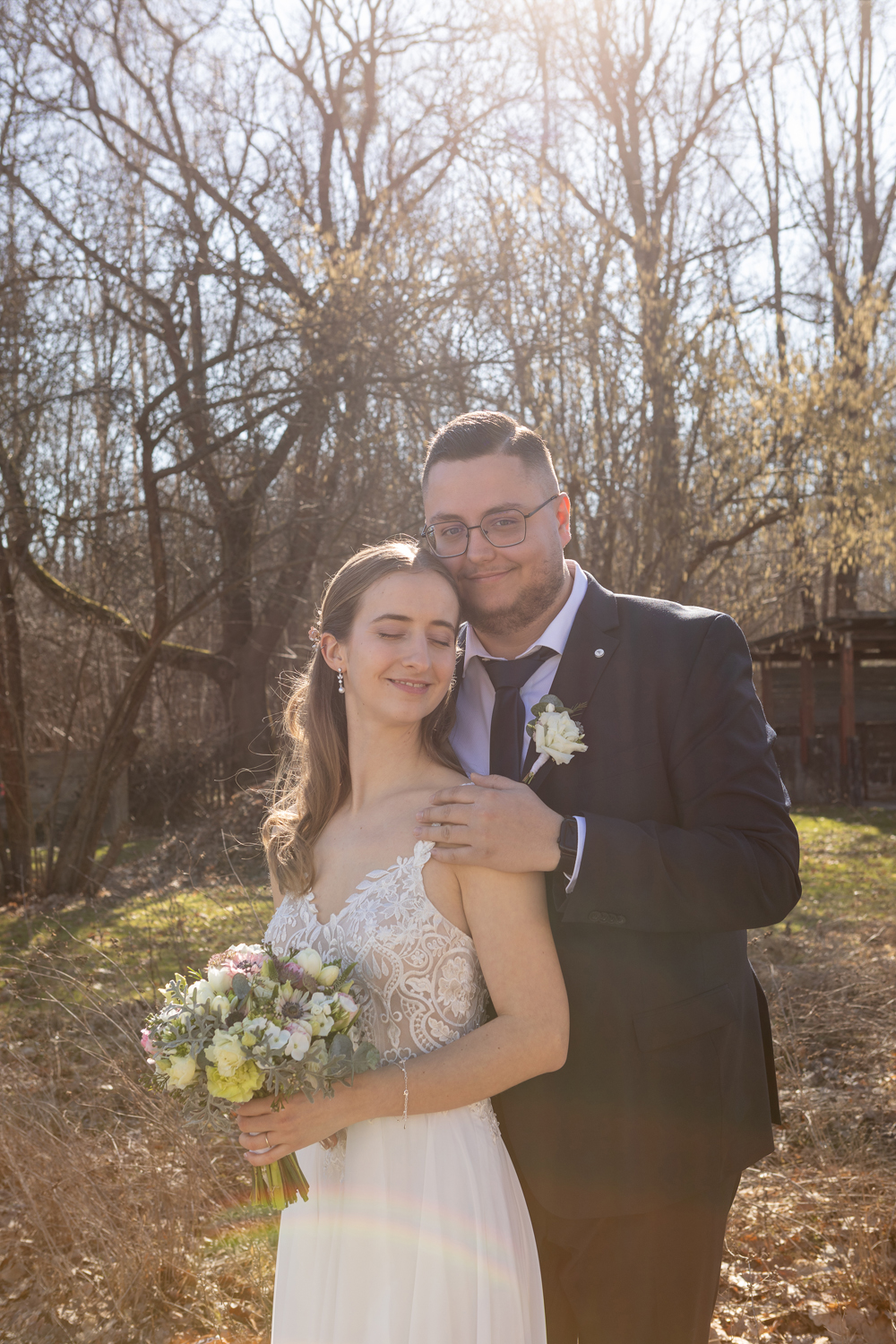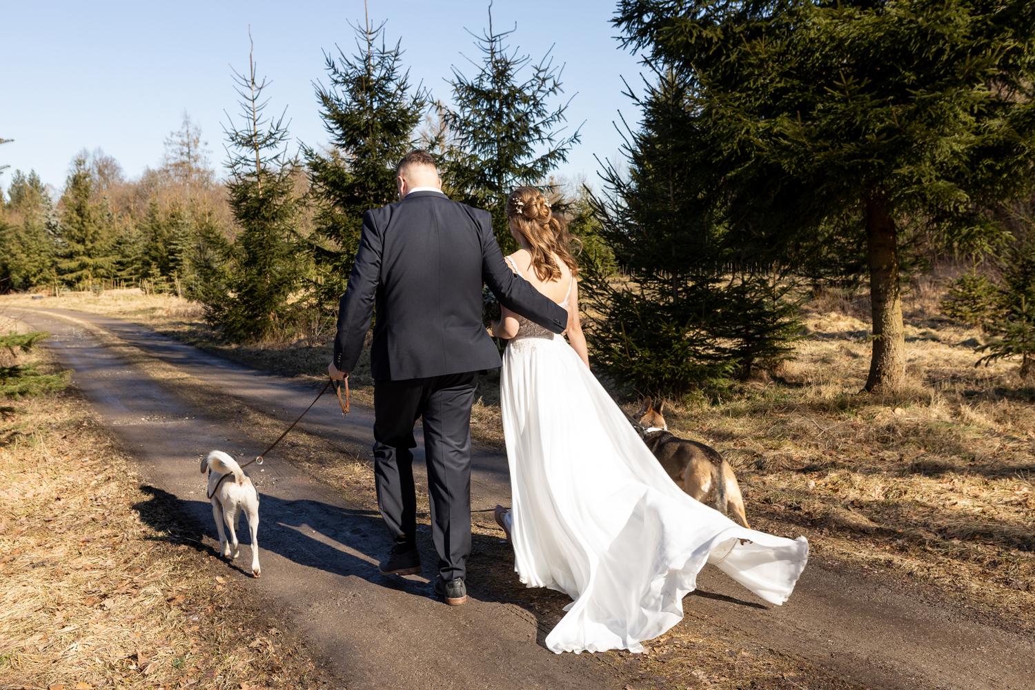 Nach der Trauung wünschte sich mein Paar ein Brautpaarshooting an einem besonderen Ort in der Nähe von Arnsdorf, ganz in der Natur. Ein Ort, an dem sie sich wohlfühlen – und an dem auch ihre beiden Hunde dabei sein konnten. Denn für die beiden gehören ihre Vierbeiner einfach zur Familie.