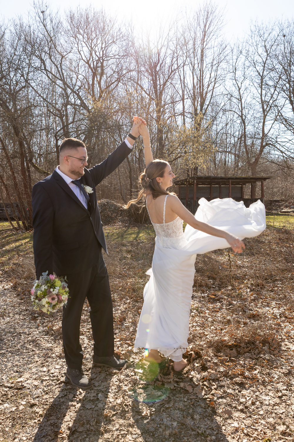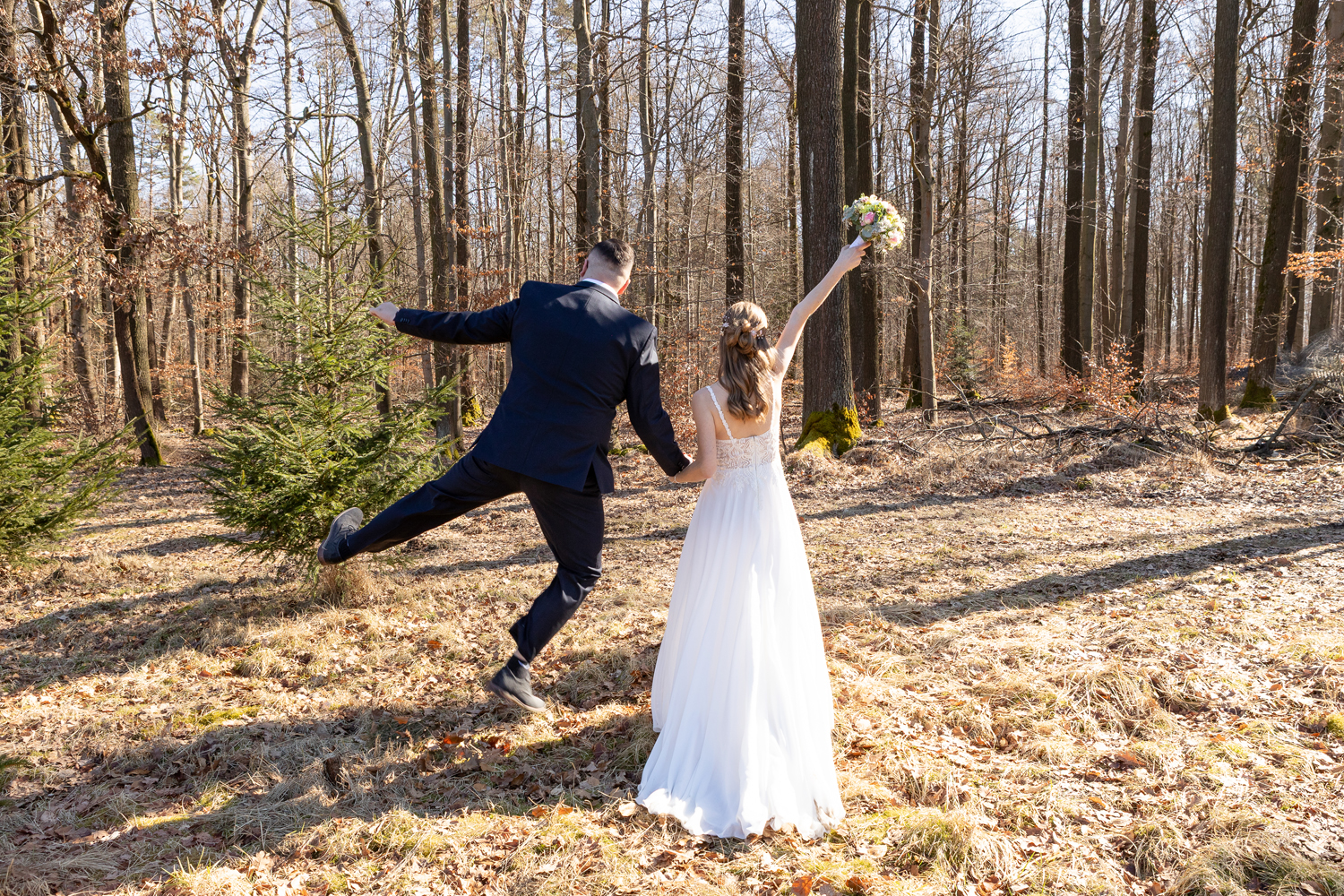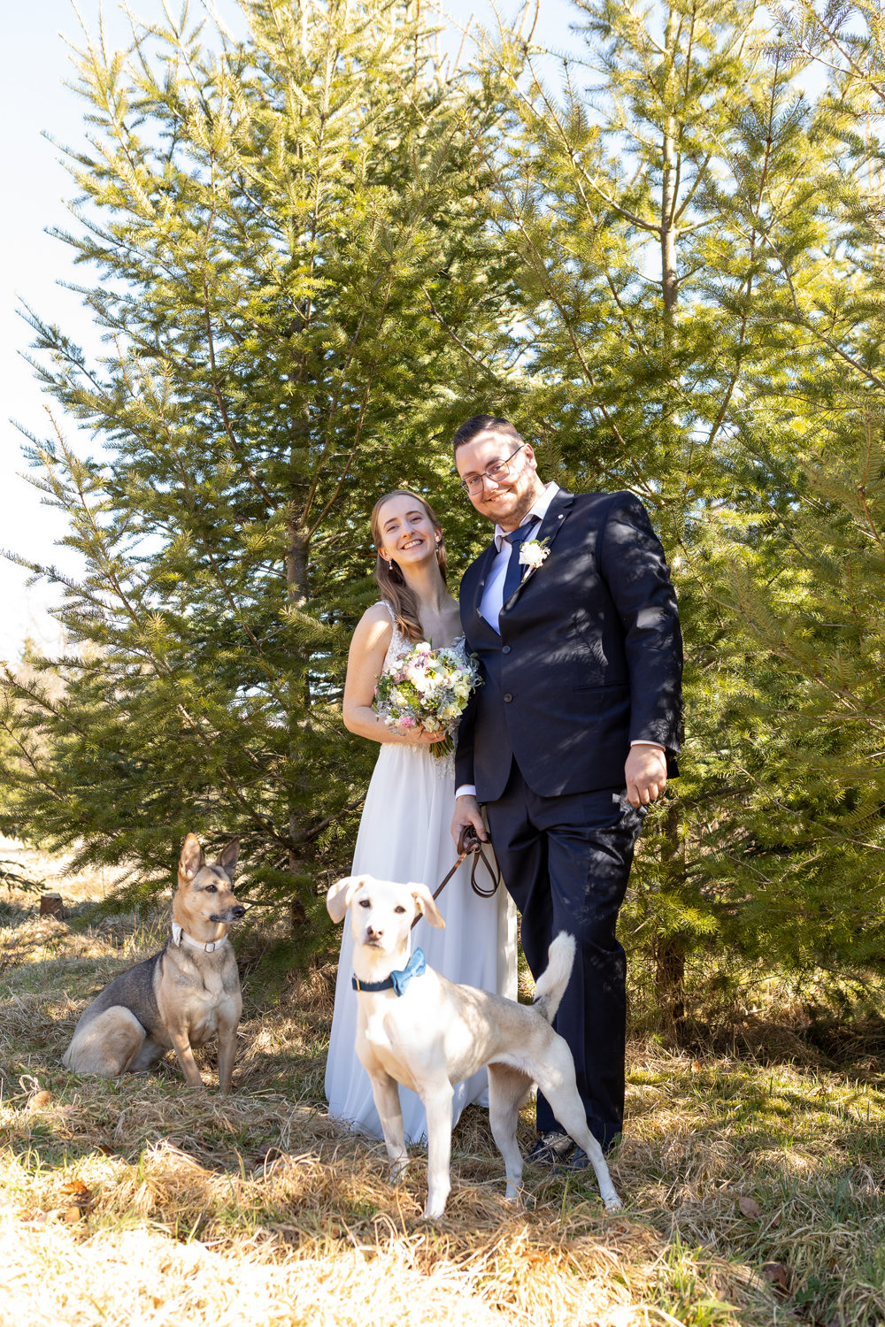 Nach der Trauung wünschte sich mein Paar ein Brautpaarshooting an einem besonderen Ort in der Nähe von Arnsdorf, ganz in der Natur. Ein Ort, an dem sie sich wohlfühlen – und an dem auch ihre beiden Hunde dabei sein konnten. Denn für die beiden gehören ihre Vierbeiner einfach zur Familie.